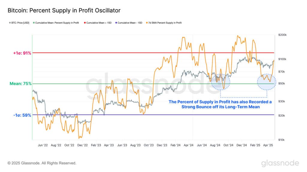 Kolejnym elementem, na który warto zwrócić uwagę, jest odsetek podaży Bitcoina znajdującej się obecnie na plusie. Wskaźnik ten patrzy na każdą monetę w sposób zero-jedynkowy — jest albo „na stracie”, albo „na zysku” w odniesieniu do ceny zakupu. Różni się to od współczynnika MVRV, który uwzględnia faktyczną wartość niezrealizowanego zysku lub straty w dolarach — czyli różnicę między ceną rynkową a kosztem nabycia.