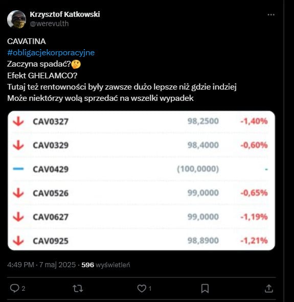 Niemniej jednak, rynek jako całość zareagował z chłodną rezerwą, nie dając się ponieść panice. Ta selektywność interpretacji ryzyka może świadczyć o dojrzewaniu rynku obligacji w Polsce. Panika nie rozlała się jeszcze na cały rynek korporacyjny. Ale przeceny zauważalne są w przypadku innej firmy z branży – Cavatina Holding.