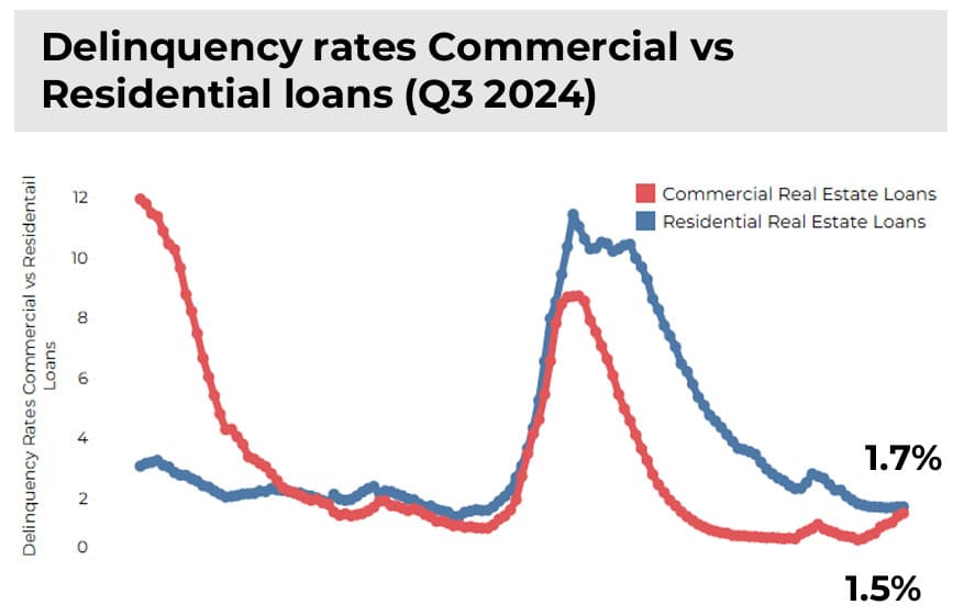 Były nimi wzrost niewynajętych powierzchni, o którym donosiły raporty wielu instytucji (m.in. Knight Frank, CBRE) – także w kontekście Polski. Oraz problemy zachodnich nieruchomości z branży. Problem ten opisywaliśmy wielokrotnie i najgłośniej było o nim w 2023 roku – gdy w Stanach Zjednoczonych miał miejsce kryzys banków regionalnych, które posiadają największą ekspozycję na kredyty CRE.