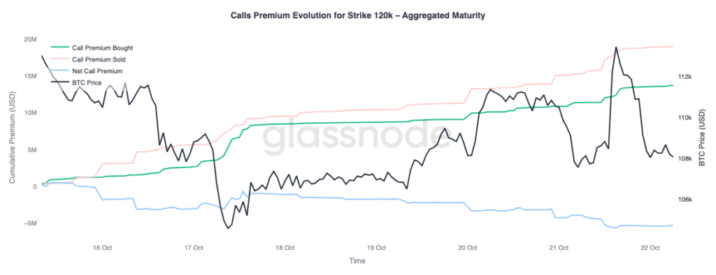 Zestawione dane Glassnode dotyczące premii opcyjnych potwierdzają ten sam wzorzec, gdy analizujemy je według strike’ów. Przy poziomie 120 tys. USD dla calli, sprzedawane premie rosną wraz z ceną – traderzy ograniczają ekspozycję na wzrosty, sprzedając zmienność przy ruchach w górę, które postrzegają jako krótkotrwałe. Krótkoterminowi poszukiwacze zysku wykorzystują skoki zmienności implikowanej, sprzedając calli podczas rajdów zamiast gonić za potencjalnym wzrostem.