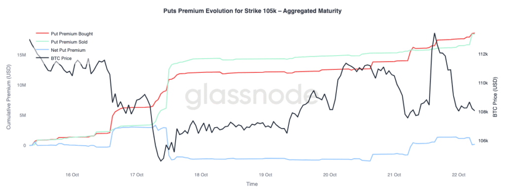 Analiza premii dla putów na poziomie 105 tys. USD ujawnia odwrócony wzorzec, który potwierdza naszą hipotezę. W miarę jak cena rosła, netto premie na 105 tys. USD put rosły. Traderzy byli bardziej skłonni płacić za ochronę przed spadkami niż inwestować w potencjalny wzrost. Oznacza to, że rajd spotkał się z hedgingiem … A nie z prawdziwym przekonaniem rynku co do dalszych wzrostów.