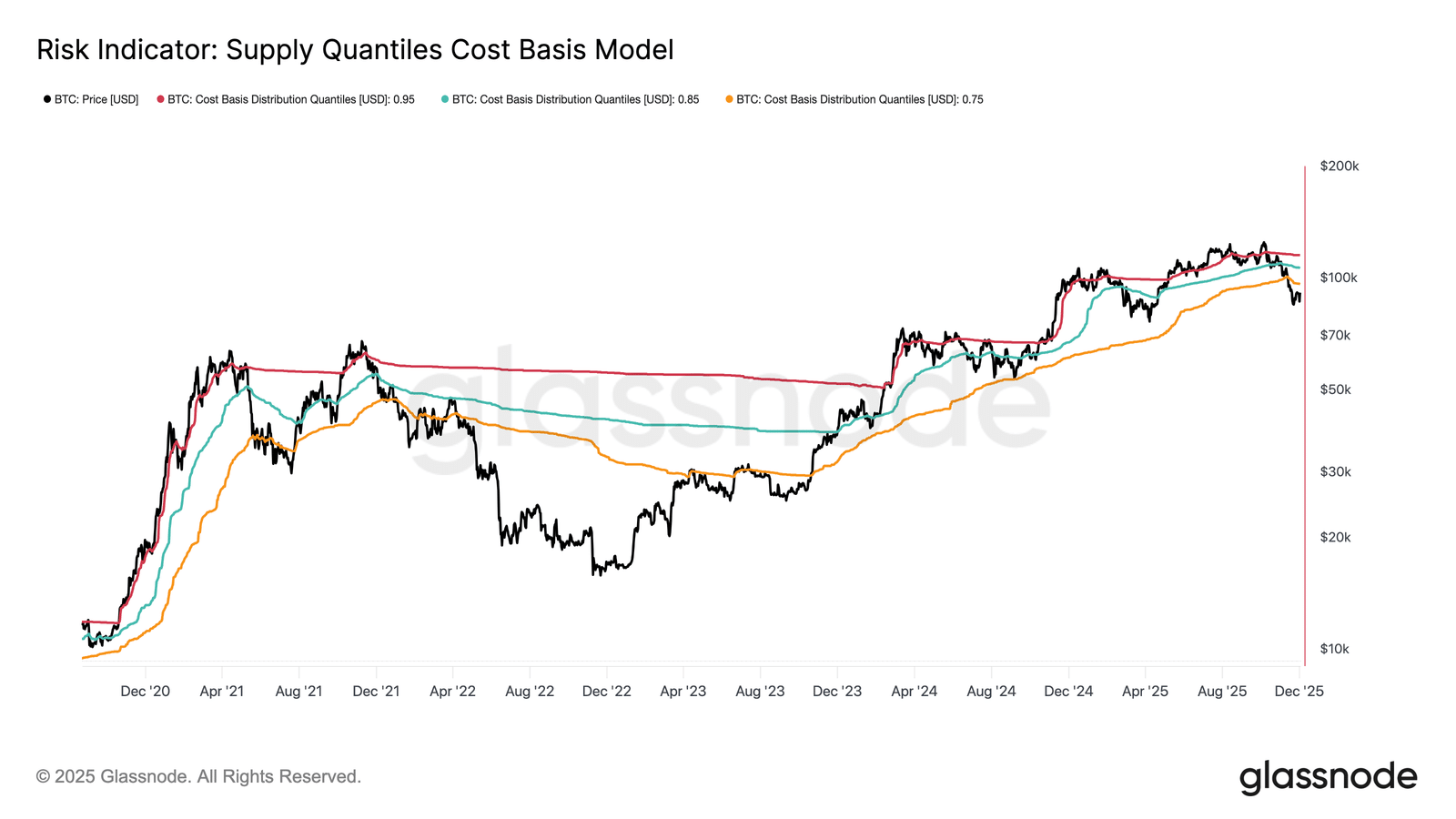 Gdy spojrzymy na model kwantyli podaży opartych o bazę średniej ceny zakupu największych nabywców, podobieństwo staje się jeszcze bardziej czytelne. Od połowy listopada cena spot spadła poniżej progu 0,75 i utknęła w rejonie 96,1 tys. USD. Oznacza to, że ponad jedna czwarta całej podaży znalazła się pod kreską.