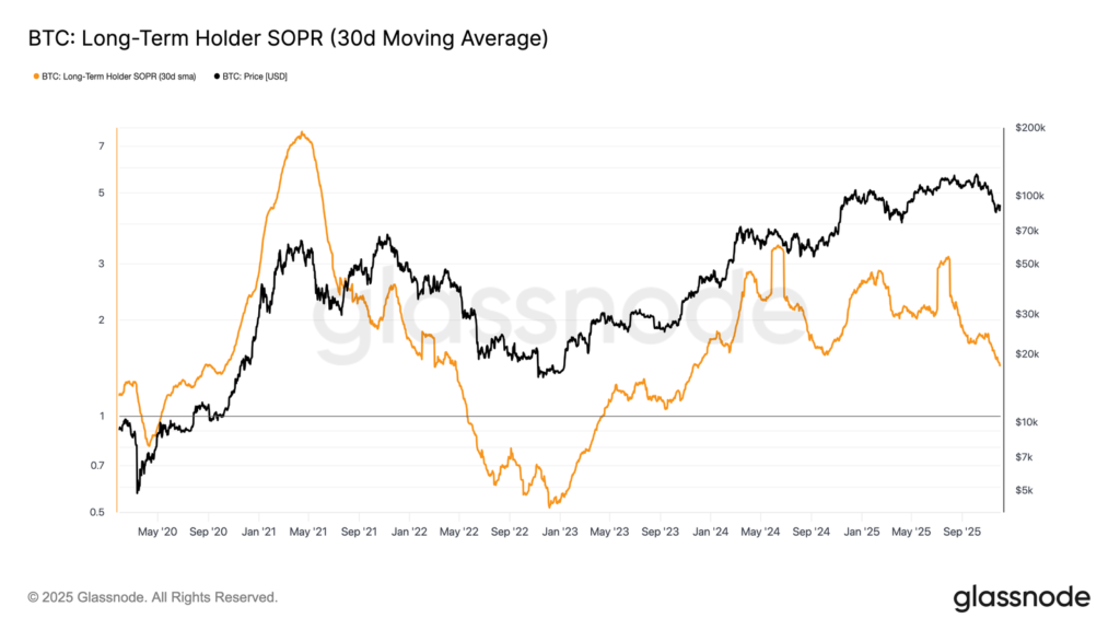 Utrzymywanie się dodatnich przepływów kapitału oznacza, że świeży popyt wciąż jest w stanie przejmować zyski realizowane przez długoterminowych inwestorów. Widać to w zachowaniu wskaźnika SOPR dla LTH w ujęciu 30-dniowej średniej, który porównuje cenę sprzedaży do bazy kosztowej starych posiadaczy.