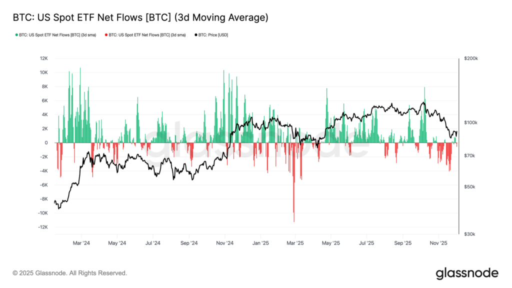 Na rynku spot coraz mocniej widać ochłodzenie zainteresowania ze strony amerykańskich ETF-ów na Bitcoina. Trzydniowa średnia przepływów netto przez cały listopad utrzymywała się już wyraźnie poniżej zera.