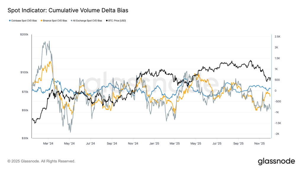 Wraz z dalszym spadkiem open interest, stawki finansowania w kontraktach perpetual ustabilizowały się w pobliżu neutralnego poziomu, oscylując wokół zera przez większą część końca listopada. To wyraźna zmiana w porównaniu z wysokimi, dodatnimi finansowaniami z okresu wcześniejszych wzrostów, sugerująca, że nadmiarowe pozycje długie zostały w dużej mierze zredukowane. Ważne jest, że krótkotrwałe, lekko ujemne okresy finansowania pozostawały płytkie i nietrwałe, co pokazuje, że traderzy nie nastawiają się agresywnie na spadki mimo obniżek cen.