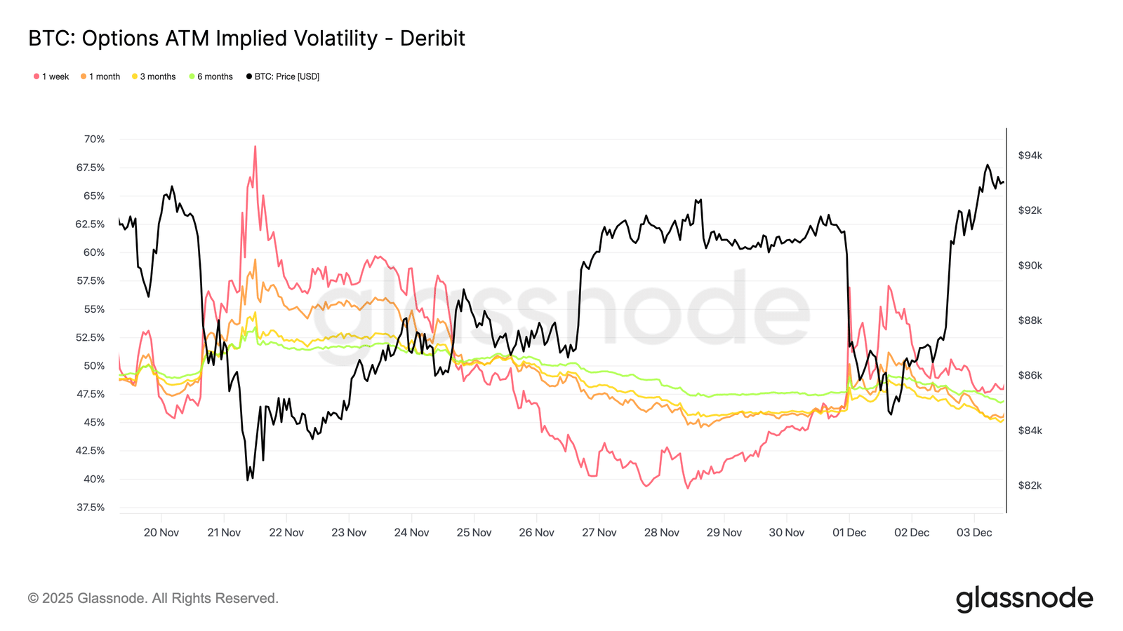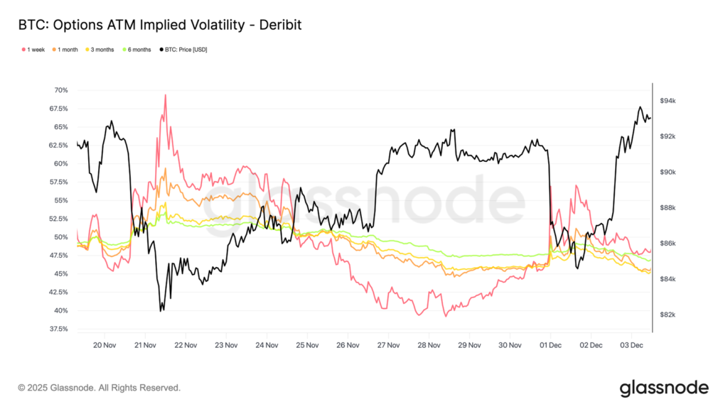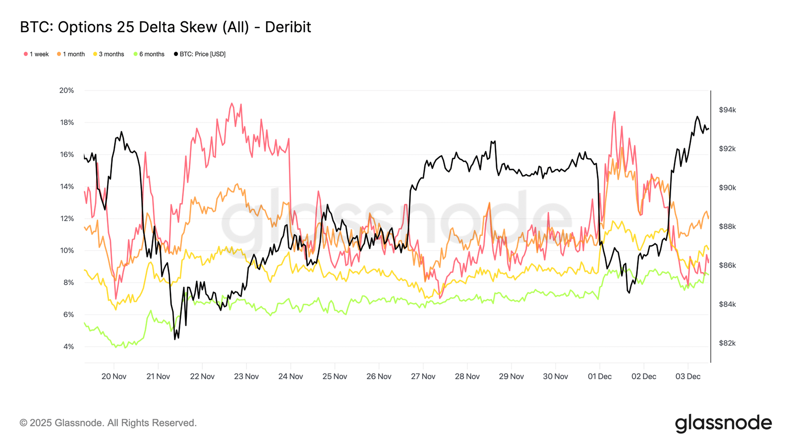 Taki jednolity spadek sugeruje, że traderzy przewidują niższe ryzyko nagłego załamania i spodziewają się spokojniejszego krótkoterminowego otoczenia. Reset IV sygnalizuje też przejście rynku w bardziej neutralną fazę, oddalając go od nadmiernej ostrożności z ubiegłego tygodnia.
