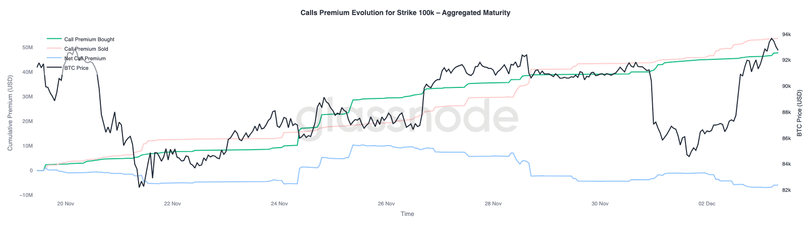 Analiza premii call na strike 100 tys. USD pokazuje, jak rynek podchodzi do tego kluczowego poziomu psychologicznego. Po prawej stronie wykresu widać, że sprzedawane premie call wciąż przewyższają kupowane, a różnica między nimi powiększyła się w trakcie ostatniego 48-godzinnego odbicia. To sugeruje, że przekonanie o odbiciu powyżej 100K pozostaje ograniczone.