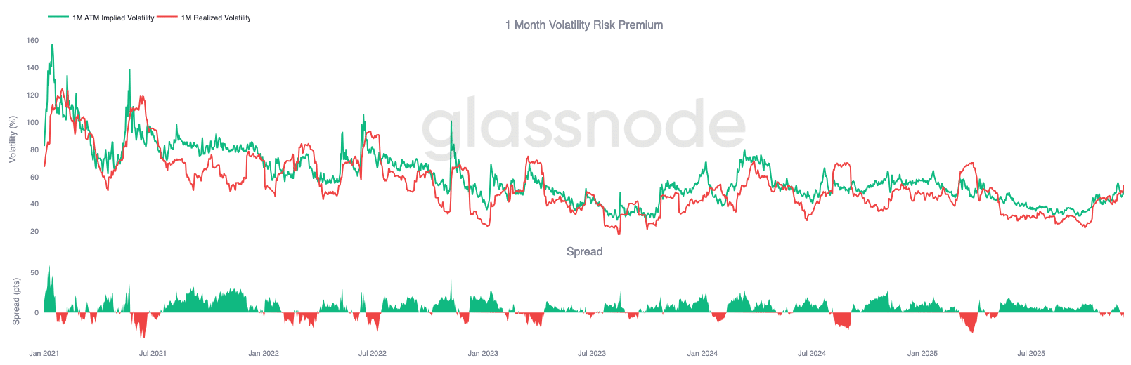 Wskaźniki off-chain potwierdzają defensywny ton rynku. Napływy do ETF-ów stały się ujemne, CVD na rynku spot spada, a open interest w futures systematycznie maleje. Stawki finansowania pozostają w okolicach neutralnych, co odzwierciedla brak jednoznacznej długiej ekspozycji i agresywnego shortu. Na rynku opcji zmienność implikowana skurczyła się, skew osłabł, przepływy odwróciły się, a opcje pozostają niedowartościowane względem zmienności realizowanej, sygnalizując ostrożność zamiast wzrost apetytu na ryzyko.