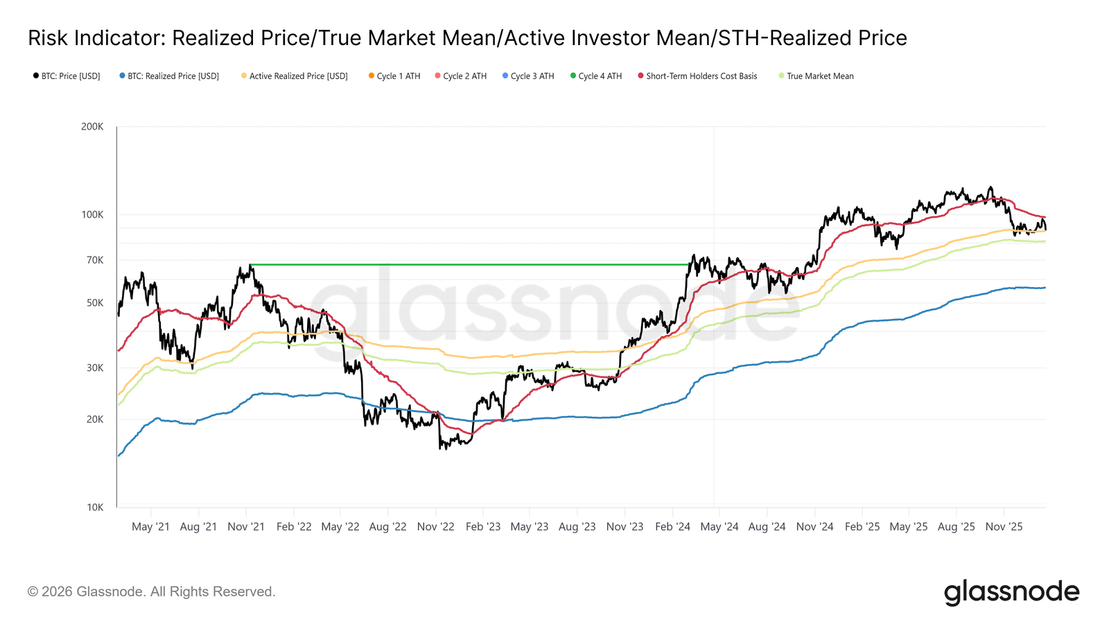 Na początku stycznia 2026 rynek pokazał pierwsze oznaki wyczerpania podaży. To pozwoliło na krótkotrwały ruch w górę w kierunku wyższych poziomów konsolidacji. Jednak zbliżając się do okolic 98 tys. USD wzrost napotkał na silny opór ze strony niedawnych nabywców, dla których ten poziom stał się punktem krytycznym.