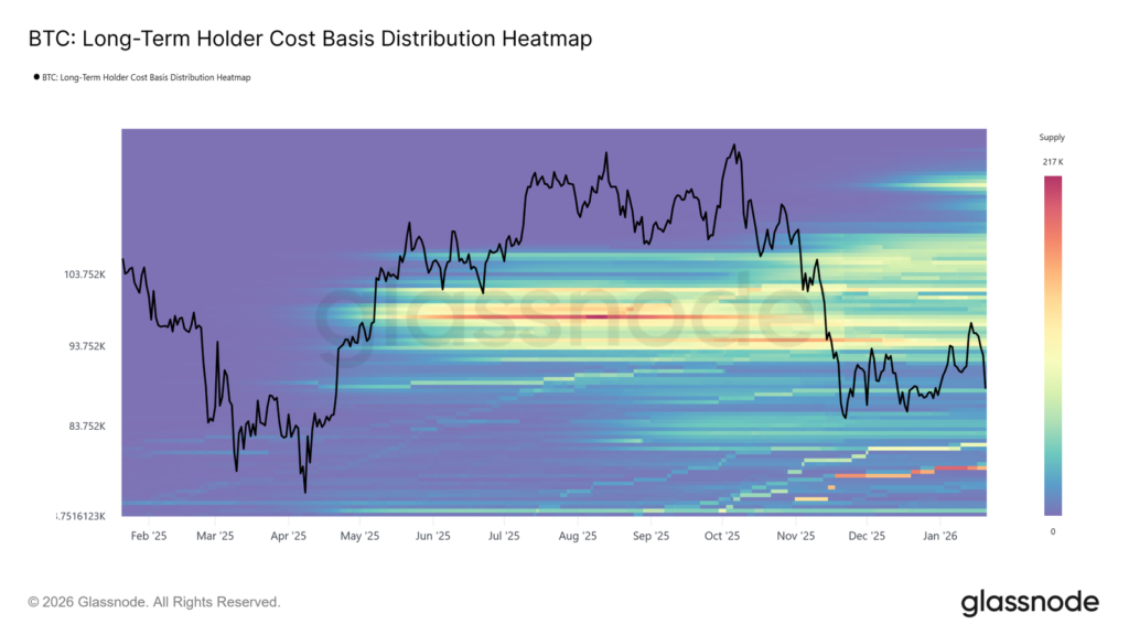Rozszerzając analizę podaży poza krótkoterminowych graczy, pozycjonowanie długoterminowych inwestorów potwierdza te same ograniczenia strukturalne. Tak zwana 'heatmapa’ (widoczna niżej) średnich cen kupna długoterminowych posiadaczy (Long-Term Holder Cost Basis Heatmap) ujawnia gęste skupisko BTC powyżej bieżącego poziomu rynkowego.