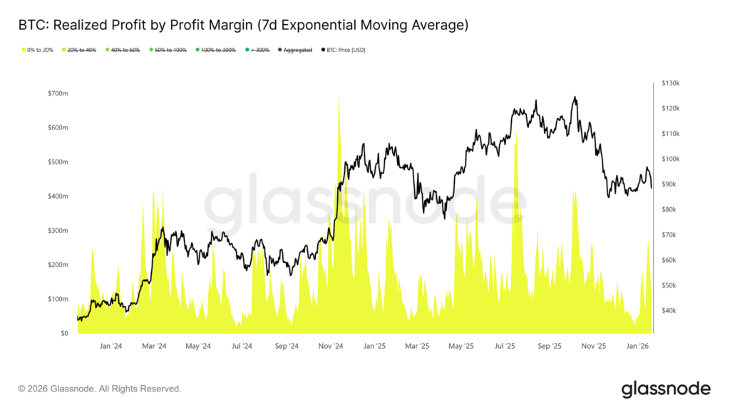 Obok wyjść wynikających ze strat, analiza zachowań realizujących zyski pozwala lepiej zrozumieć, kto dostarcza płynność podczas ostatniego odbicia. Według wskaźnika Realized Profit by Profit Margin, znacząco wzrosła aktywność grupy inwestorów zamykających pozycje z zyskiem na poziomie 0 do 20%.