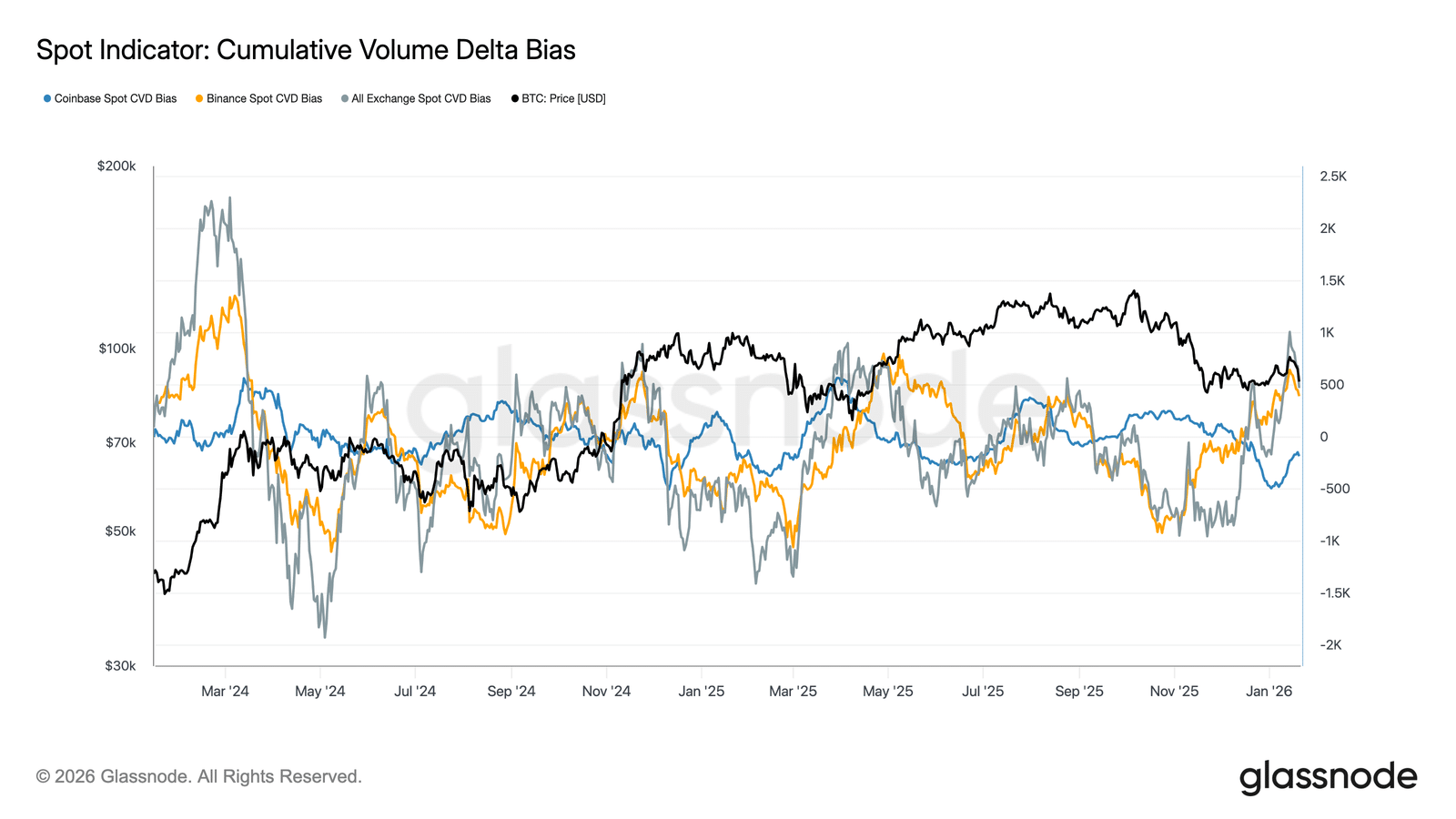 Zachowanie rynku spot zaczęło się poprawiać po ostatnim spadku, a wskaźniki CVD na Binance i w ujęciu agregowanym wskazują na powrót do przewagi kupujących. To wyraźna zmiana w porównaniu z wcześniejszą konsolidacją, która była zdominowana przez stałą presję sprzedaży, sugerując, że uczestnicy rynku znów wchłaniają podaż zamiast ją odsprzedawać przy wzrostach.