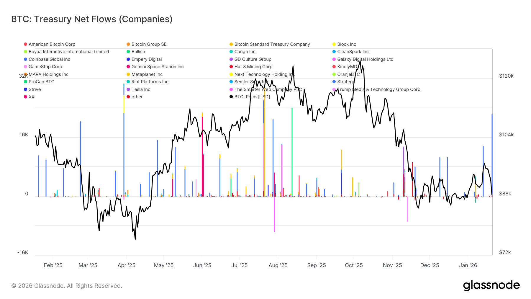 Ostatnie dane dotyczące przepływów netto w skarbcach korporacyjnych wskazują na nieregularną i rozproszoną aktywność, zdominowaną przez pojedyncze, wywołane wydarzeniami transakcje, zamiast systematycznej akumulacji. Choć niektóre firmy odnotowały wyraźne impulsy napływu kapitału w ostatnich tygodniach, ogólny popyt korporacyjny nie przeszedł jeszcze w fazę trwałej akumulacji.