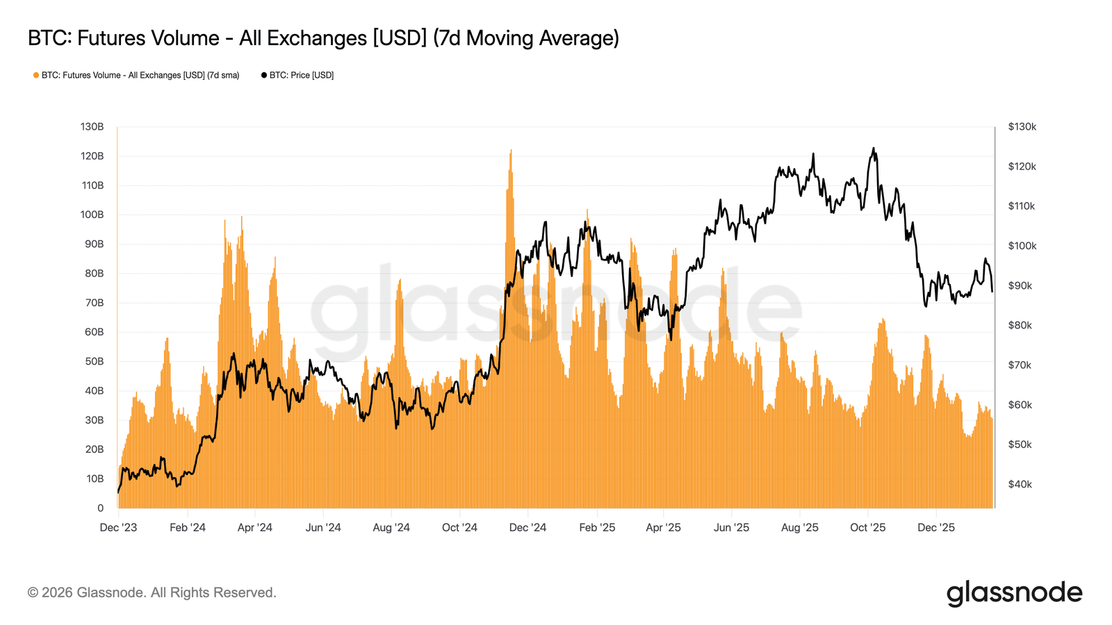 Wolumen handlu kontraktami futures na BTC wciąż się kurczy. Jeśli spojrzeć na średnią kroczącą z 7 dni, pozostając znacznie poniżej poziomów typowych dla okresów trwałych trendów. Ostatnie ruchy cenowe miały miejsce bez istotnego wzrostu aktywności, co wskazuje na rynek pochodnych o niskim zaangażowaniu i ograniczonej determinacji uczestników.