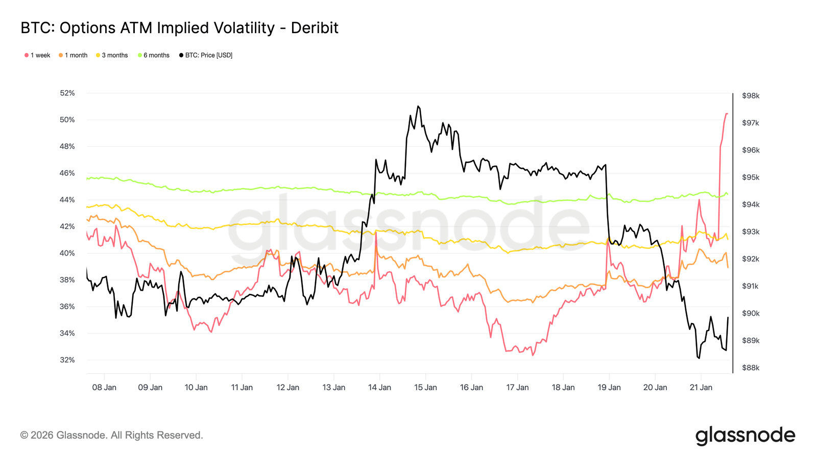 Sprzedaż na rynku spot wywołana wydarzeniami makroekonomicznymi i geopolitycznymi odbiła się głównie na krótkoterminowej zmienności. Implikowana zmienność na jeden tydzień wzrosła o ponad 13 punktów od niedzielnego spadku, podczas gdy trzy miesięczna zmienność podniosła się jedynie o około 2 punkty, a sześciomiesięczna praktycznie pozostała bez zmian.