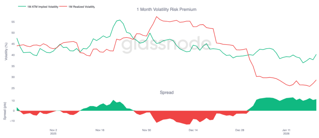 Miesięczna premia za ryzyko zmienności utrzymuje się w strefie dodatniej, tak jak od początku roku. Pomimo że implikowana zmienność pozostaje historycznie niska w ujęciu absolutnym, wciąż wyceniana jest powyżej zmienności zrealizowanej. Innymi słowy, opcje pozostają relatywnie kosztowne w porównaniu do faktycznych ruchów cenowych.