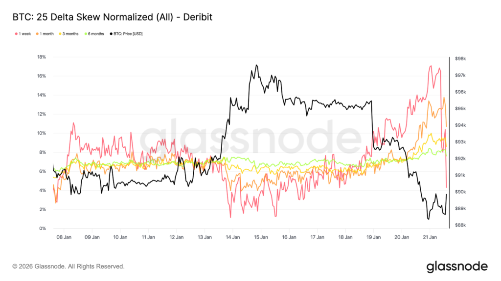 Gdy zachowuje się tak gwałtownie, często sygnalizuje lokalne ekstrema, w których pozycjonowanie staje się skumulowane, a rynek ma trudności z kontynuacją w tym samym kierunku. Po wypowiedzi Donalda Trumpa podczas Davos przewaga po stronie spadkowej została zrealizowana. Skośność zaczęła szybko się odwracać, niemal tak samo dynamicznie, jak wcześniej wzrosła.