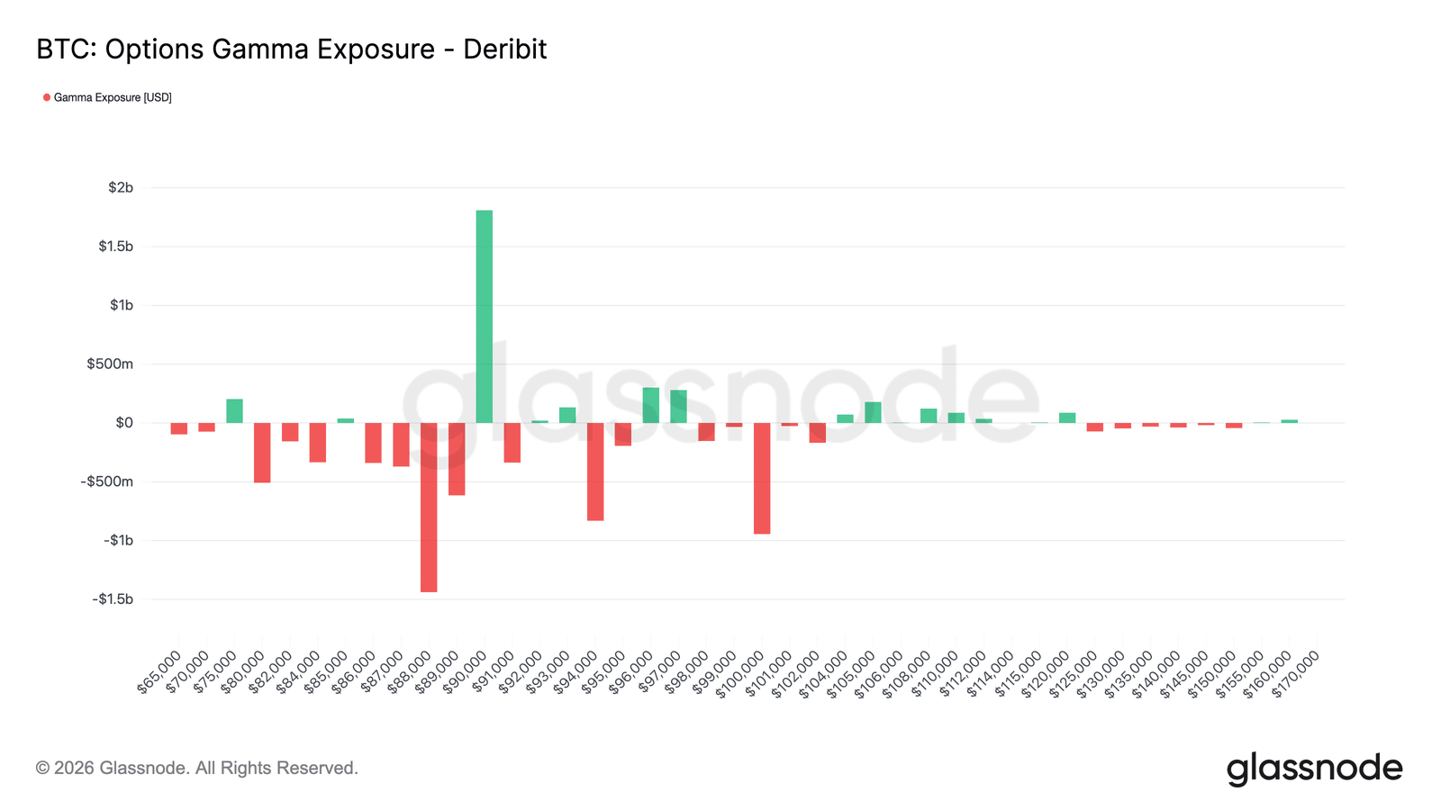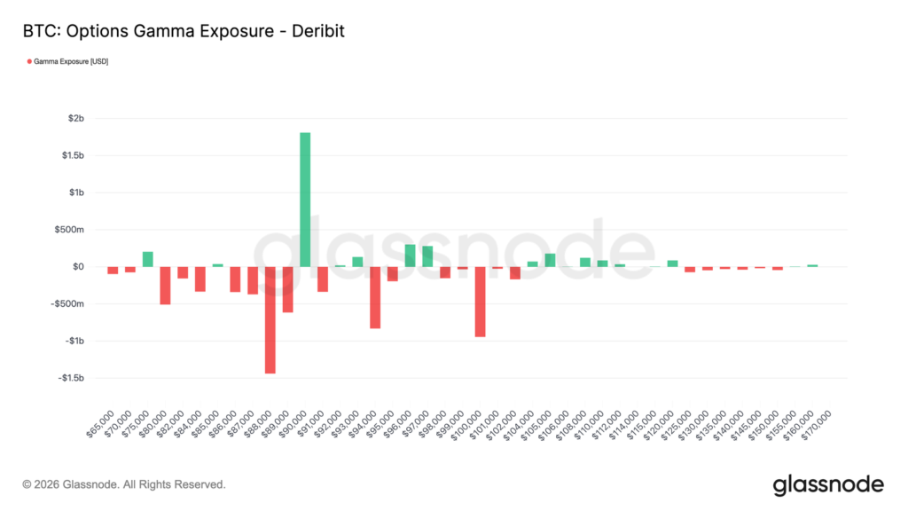 Taka asymetria tworzy specyficzną dynamikę rynku. Poniżej $90 tys., krótkie pozycje dealerów gamma mogą przyspieszać spadki, ponieważ hedging jest realizowany poprzez sprzedaż futures lub instrumentów spot. Powyżej $90 tys., long gamma dealerów działa stabilizująco — wzrosty spotykają się z przepływami hedgingowymi, które ograniczają dalszą ekspansję cen.
