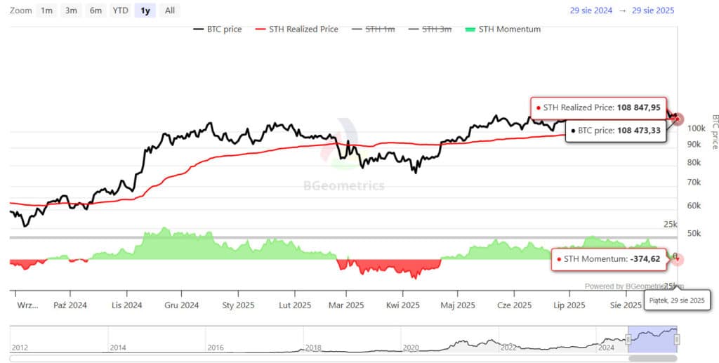 Jeśli obecna słabość utrzyma się, a cena będzie pozostawać poniżej kosztu bazowego posiadaczy krótkoterminowych (ok. 108,9 tys. USD), historia sugeruje ostrożność. W poprzednich cyklach takie przełamania często zapowiadały kilkumiesięczne fazy spadkowe, gdy nowsi inwestorzy pod naporem strat niezrealizowanych decydowali się na kapitulację.
