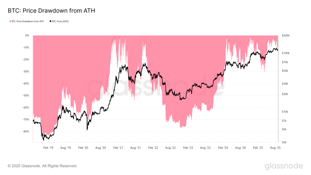 Tymczasem obecny spadek do poziomu 110,1 tys. USD oznacza korektę rzędu ~11,4% względem rekordu 124 tys. USD. To wartość relatywnie skromna — znacznie mniejsza niż typowe cofnięcia w połowie cyklu, które zwykle przekraczały 25%, nie mówiąc już o głębokich dołkach cyklicznych, gdzie straty przekraczały 75%. Na tym tle bieżąca korekta jawi się jako płytka i nie przypomina jeszcze profilu stresu charakterystycznego dla historycznych ekstremów.