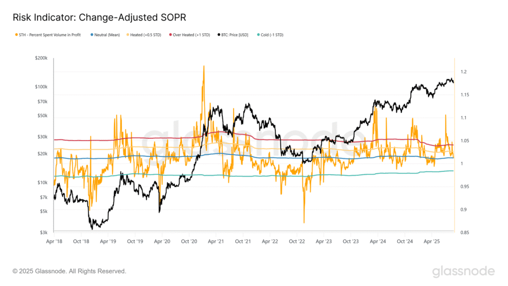Obecnie 7-dniowa średnia ruchoma skorygowanego SOPR (oczyszczonego z transferów wewnętrznych) oscyluje blisko neutralnego poziomu 1. Oznacza to, że większość aktywnych uczestników rynku nie realizuje ani istotnych zysków, ani wyraźnych strat. Dominuje stan niepewności.