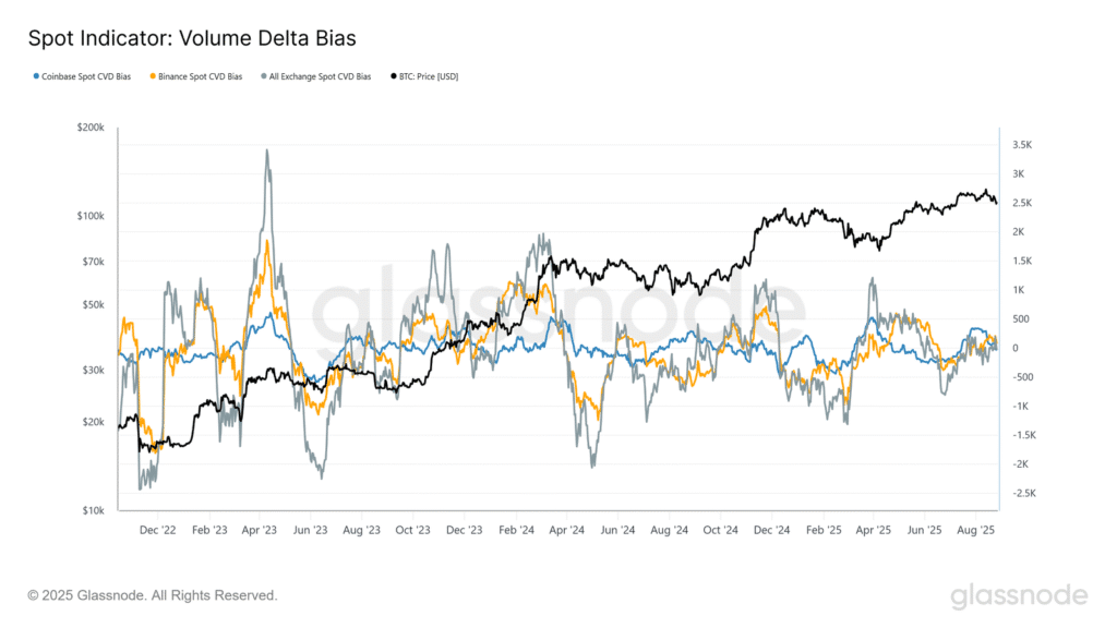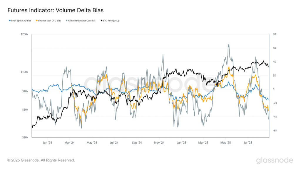 To wyraźna zmiana w stosunku do silnej presji kupujących, obserwowanej w kwietniu 2025 r., która napędzała odbicie z poziomu 72 tys. USD. Choć niewielki wzrost w lipcu przyczynił się do rajdu w kierunku 124 tys. USD, obecny trend wskazuje na neutralizację sentymentu spot, co sugeruje mniejszą determinację nabywców przy obecnych cenach.