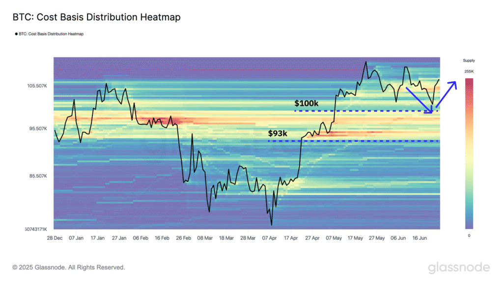 Weekendowy spadek Bitcoina w okolice 99 tys. USD zatrzymał się dokładnie tam, gdzie powinien — na górnej granicy silnej strefy podażowo-popytowej zlokalizowanej pomiędzy 93 a 100 tys. dolarów. Dane z CBD Heatmap pokazują, że to właśnie w tym przedziale rynek wielokrotnie konsolidował się podczas tworzenia szczytu w pierwszym kwartale 2025 roku, co czyni go jednym z kluczowych fundamentów obecnej struktury wzrostowej.