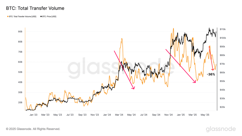 Wraz z wyhamowaniem dynamiki cenowej Bitcoina, zauważalne jest również stopniowe ochłodzenie kluczowych wskaźników aktywności on-chain. Jednym z bardziej wymownych sygnałów jest spadek 7-dniowej średniej z dziennego wolumenu transferów on-chain. Od szczytu na poziomie 76 miliardów dolarów pod koniec maja, do zaledwie 52 miliardów w miniony weekend. To spadek o około 32%.