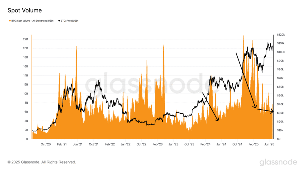W przeciwieństwie do dynamicznych zwyżek, które wyniosły Bitcoina na nowe szczyty w II i IV kwartale 2024 roku, ostatni rajd w kierunku 111 tys. dolarów nie został poparty wyraźnym wzrostem wolumenu spot. Obecnie dzienny obrót na rynku spot oscyluje wokół 7,7 miliarda dolarów — to wyraźnie poniżej wartości obserwowanych podczas poprzednich faz euforycznego wzrostu w tej hossie.