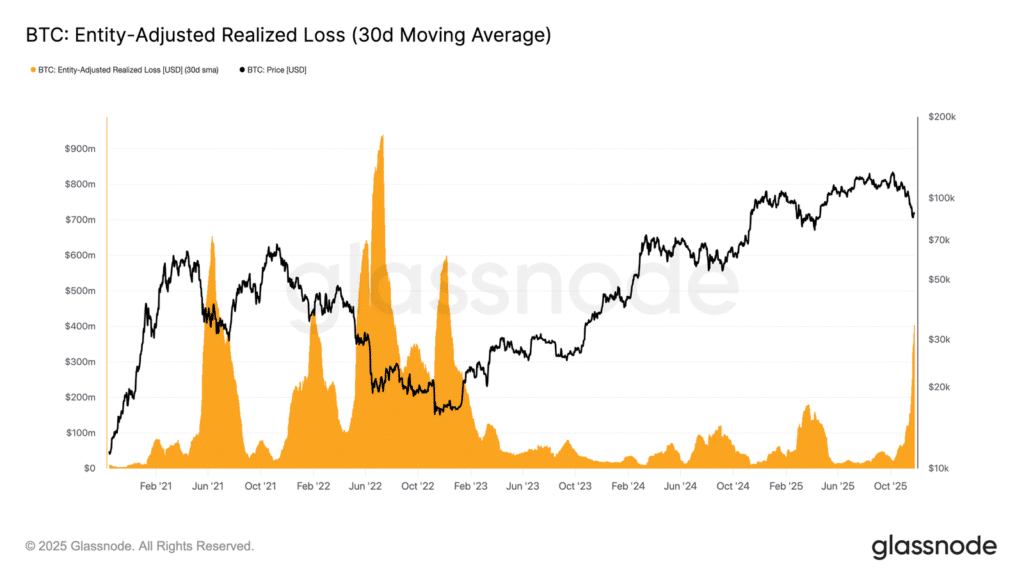Patrząc głębiej na analogię do pierwszego kwartału 2022 roku, Glassnode wskazuje na wyraźny wzrost wskaźnika Entity-Adjusted Realized Loss (30-dniowa średnia), który obecnie osiąga 403,4 mln USD dziennie. To poziom przewyższający straty zrealizowane w trakcie największych dołków w tym cyklu. To wskazuje na wyraźne osłabienie zaufania do trendu wzrostowego. Tak wysoka realizacja strat jest typowa dla rynku poszukującego płynności, gdzie inwestorzy coraz częściej wychodzą z pozycji ze stratą w miarę słabnięcia momentum.