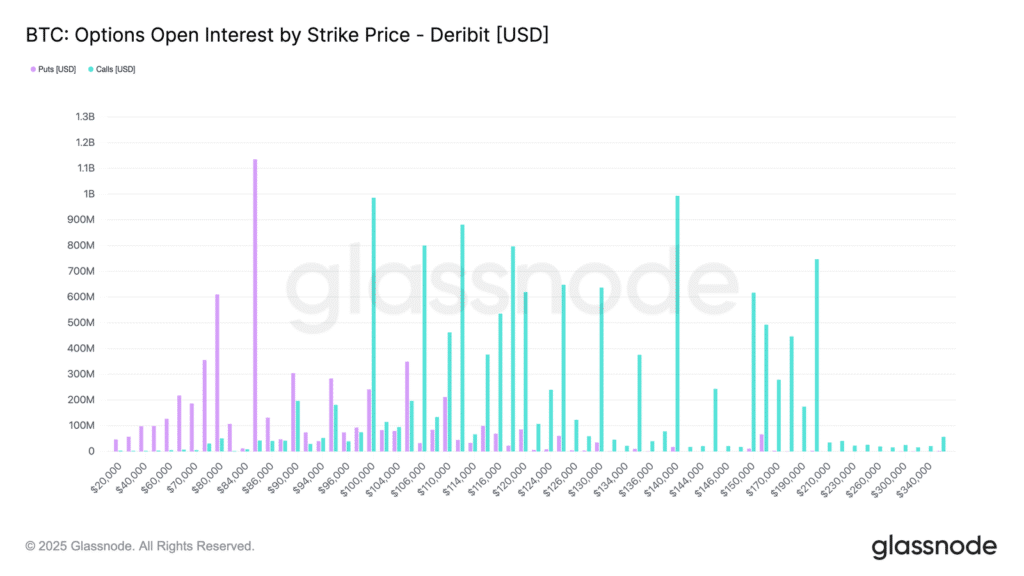 Rozkład strike pokazuje dużą koncentrację opcji put w okolicach 84 tys. USD oraz rosnące zainteresowanie opcjami call w rejonie 100 tys. USD. Strefa między tymi strike’ami jest stosunkowo cienka, co tworzy przestrzeń do gwałtowniejszych ruchów w tym zakresie.