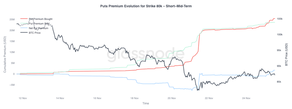 Patrząc na przepływy, aktywność wokół opcji put w rejonie 80 tys. USD pokazuje, jak ewoluowało zapotrzebowanie na ochronę przed spadkiem w krótkim i średnim terminie. Popyt na puty ustabilizował się w ciągu ostatnich czterech dni, równolegle z odbiciem, które rozpoczęło się w okolicach 80,5 tys. USD.