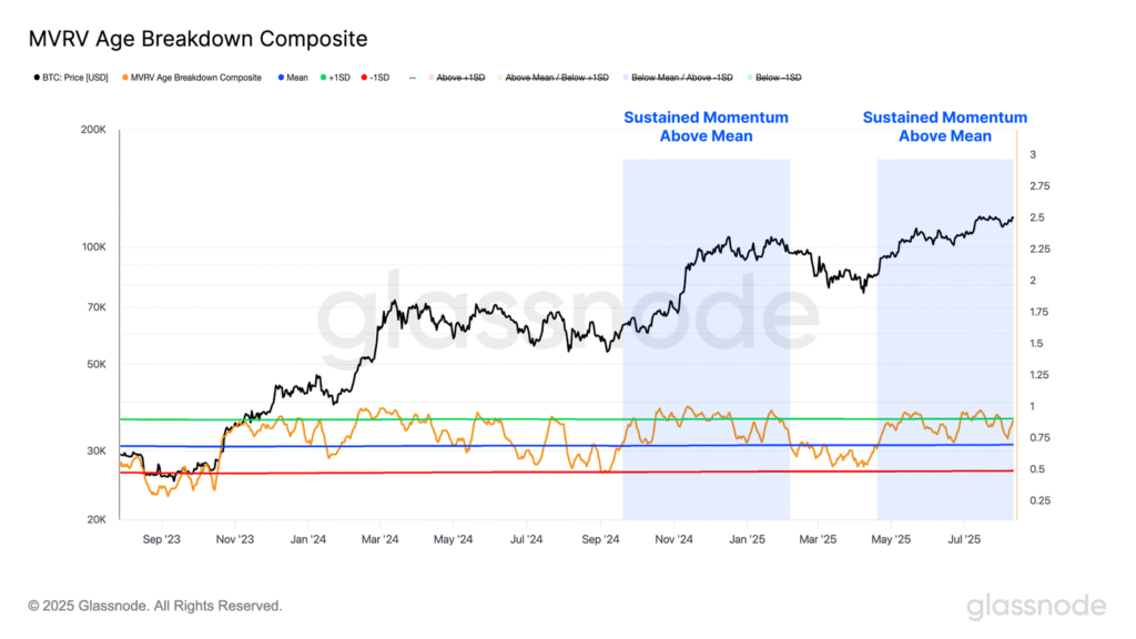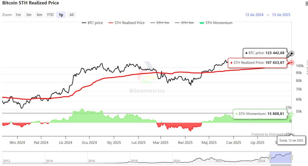 Wskaźnik ten utrzymał się powyżej średniej w trakcie ostatniej korekty, znajdując tam solidne wsparcie. To potwierdza, że większość inwestorów pozostała na plusie, co w połączeniu z niewielkimi stratami odnotowanymi w STH-SOPR wskazuje na minimalną presję kapitulacyjną. Utrzymanie tego progu sygnalizuje poprawę warunków rynkowych i tworzy sprzyjające tło dla dalszego wzrostowego impetu.