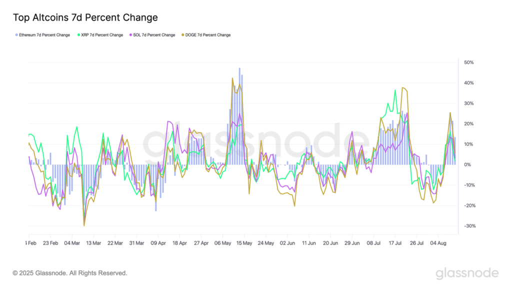 Innym sposobem oceny kondycji czołowych altcoinów jest wg. Glassnode’a stworzenie koszyka ważonego kapitalizacją rynkową. Oraz przeanalizowanie jego 7-dniowych logarytmicznych stóp zwrotu, co pozwala naturalnie uwzględnić różnice skali między poszczególnymi aktywami.