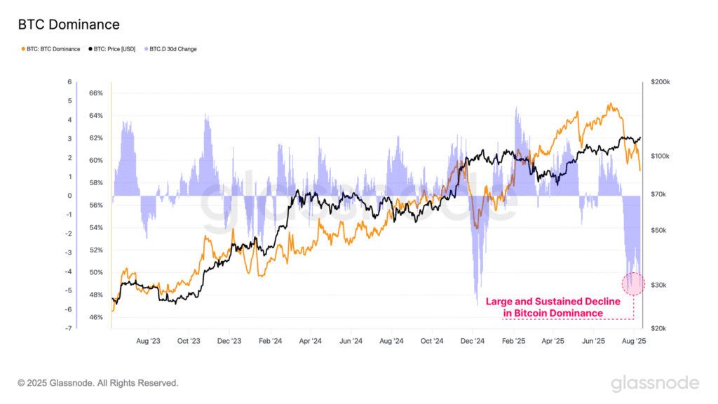 Ten przepływ kapitału widać wyraźnie w metryce Bitcoin Dominance od Glassnode. To ona mierzy udział BTC w całkowitej kapitalizacji rynku aktywów cyfrowych. W ciągu ostatnich dwóch miesięcy wskaźnik spadł z 65% do 59%… A to potwierdza trwającą rotację środków w stronę bardziej ryzykownych segmentów rynku crypto. Euforia staje się faktem.