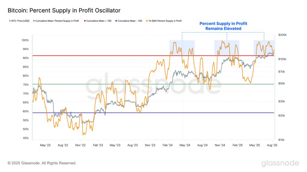 Ostatnie odbicie cen wspierają solidne fundamenty on-chain. Odsetek podaży w obiegu znajdującej się w zysku utrzymał się na wysokim poziomie nawet w trakcie korekty, znajdując wsparcie na poziomie +1σ. Oznacza to, że zdecydowana większość uczestników rynku — około 95% — wciąż posiada niezrealizowane zyski i pozostaje w komfortowej, rentownej pozycji.