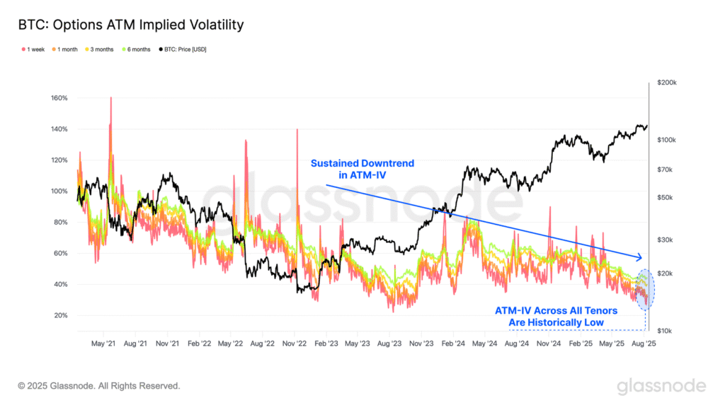 Bitcoin wciąż utrzymuje mocny impet, co potwierdzają kluczowe wskaźniki on-chain. Podczas ostatniego cofnięcia do 112 tys. USD krótkoterminowi posiadacze realizowali straty w minimalnym zakresie, a większość inwestorów pozostaje na plusie. Rynek opcji natomiast wycenia dalszy okres niskiej zmienności. Wskaźnik implied volatility dla opcji at-the-money we wszystkich horyzontach czasowych znajduje się na wieloletnich minimach.
