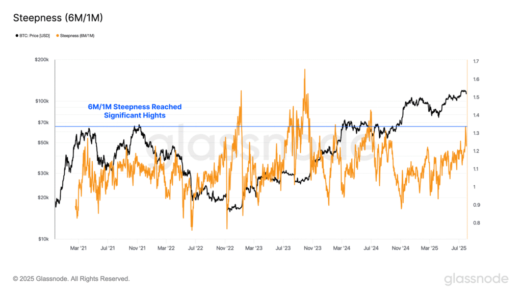 Kolejnym narzędziem pozwalającym ocenić nastroje na rynku opcji jest stosunek 6M/1M IV, który pokazuje, jak zmieniają się oczekiwania co do zmienności w różnych horyzontach czasowych. Zmiany nachylenia tej krzywej pozwalają stwierdzić, czy uczestnicy rynku widzą większe ryzyko w krótkim terminie, czy raczej spodziewają się jego narastania w dłuższym okresie — a to pomaga lepiej uchwycić momenty potencjalnego stresu lub euforii.