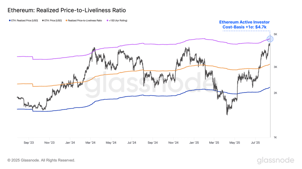 Przy obecnym rajdzie Ethereum ciekawym punktem odniesienia dla potencjalnych celów wzrostowych jest poziom +1 odchylenia standardowego względem Active Realized Price. Historycznie ten próg wyznaczał strefy, w których zaczyna się kumulować presja sprzedażowa. Dziś znajduje się on w okolicach 4,7 tys. USD i przy obecnych warunkach rynkowych może wskazywać obszar przegrzania rynku.