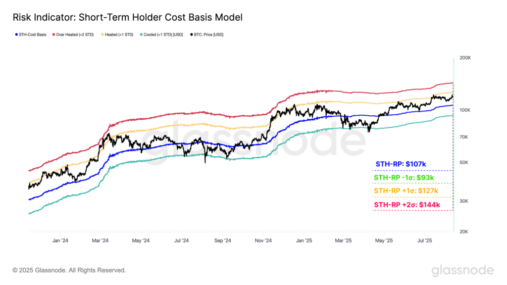 W przypadku Bitcoina ciekawym narzędziem do oceny potencjalnych poziomów oporu jest tzw. Short-Term Holder (STH) cost basis, czyli średnia cena nabycia przez świeższych uczestników rynku. Historycznie ten poziom często wyznacza granicę między lokalnymi fazami byczymi i niedźwiedzimi. Aby nadać analizie kontekst statystyczny, można zastosować pasma odchyleń standardowych wokół tej wartości, co pomaga ocenić, czy rynek jest przegrzany lub niedogrzany.
