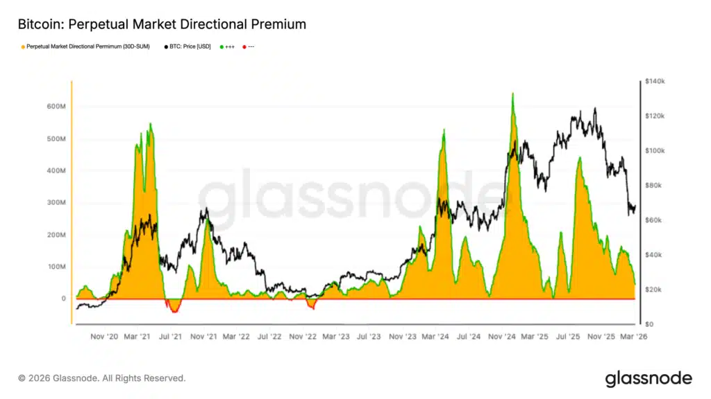 Choć spadek premii odzwierciedla słabnący impet wzrostowy, jednocześnie pokazuje, że nadmierna dźwignia jest stopniowo usuwana z rynku. Stabilizacja wskaźnika mogłaby sygnalizować, że pozycjonowanie na rynku pochodnych zbliża się do neutralnego punktu równowagi.