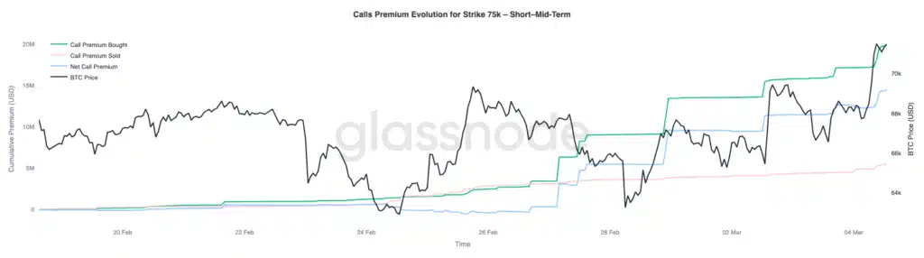 Analizując dynamikę premii dla calli na tym strike’u w kolejnych trzech miesięcznych wygaśnięciach, odnotowano łącznie około 14,5 mln USD netto premii kupionej w porównaniu z premii sprzedanej. Co istotne, niemal dwie trzecie tej wartości zgromadzono w ostatnim tygodniu, napędzając bieżące odbicie ceny.
