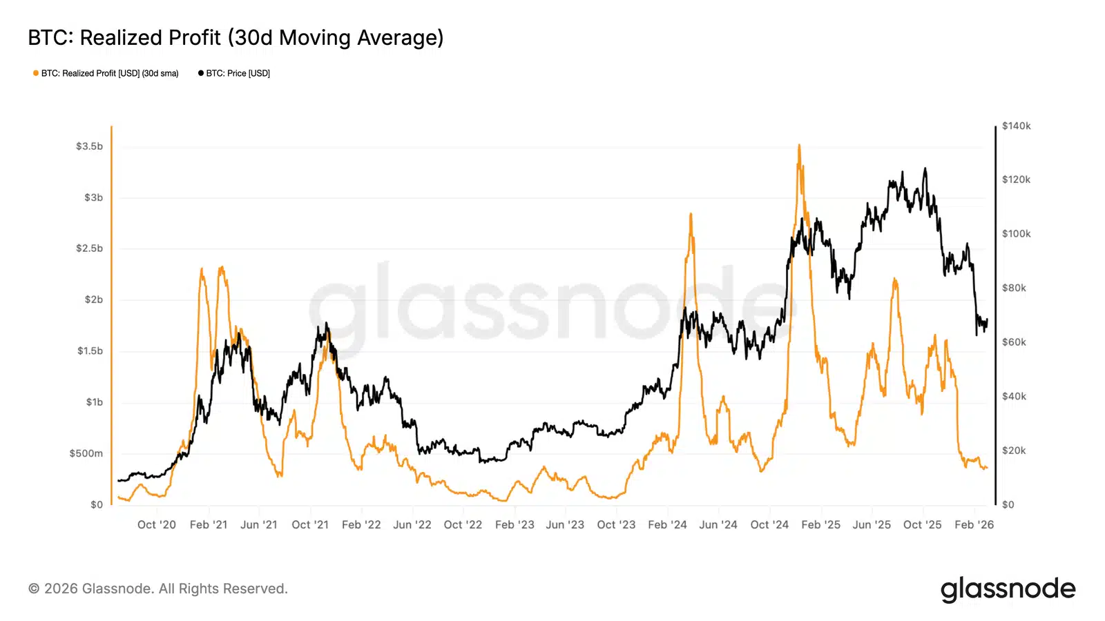 Od początku lutego Bitcoin kilkukrotnie nie zdołał utrzymać tygodniowego zamknięcia powyżej 70 000 USD… Wyraźnie sygnalizując, że ten poziom pełni funkcję istotnego oporu krótkoterminowego. Aby ocenić, czy odrzucenie ceny rzeczywiście odzwierciedla spadek popytu, warto wg. Glassnode’a spojrzeć na 30-dniową prostą średnią zrealizowanego zysku (30D-SMA Realized Profit). Ten wskaźnik sumuje zyski wyrażone w dolarach, które uczestnicy rynku zamykają w momencie sprzedaży BTC, a wygładzenie eliminuje krótkoterminowy 'szum’.