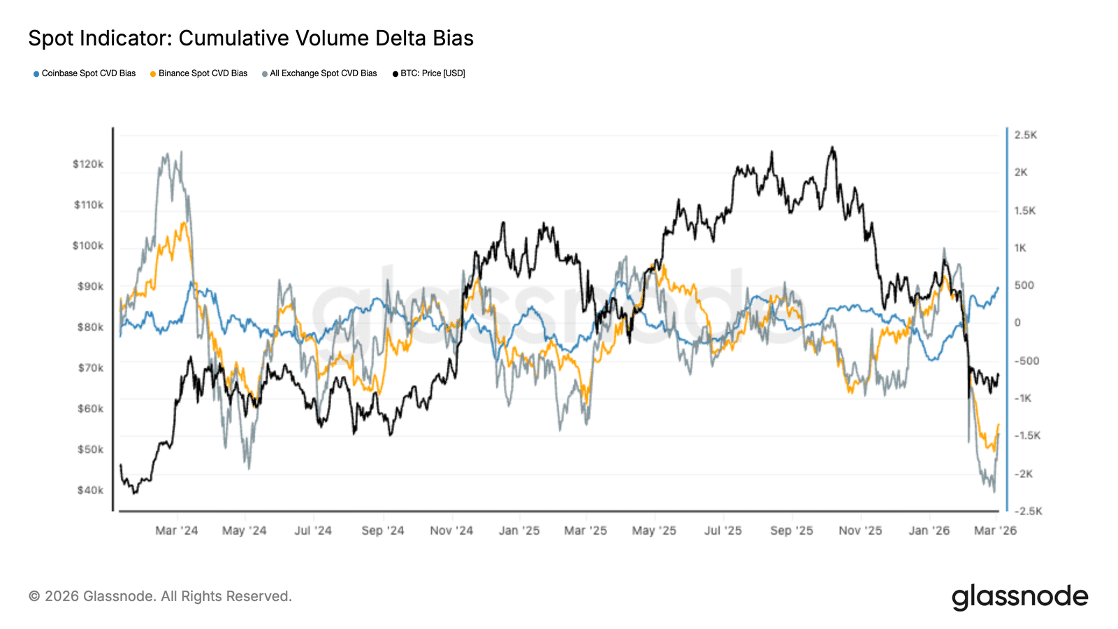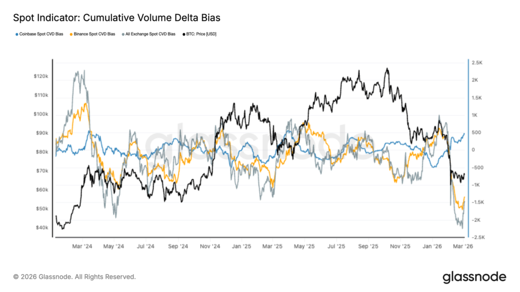 Ostatnie tygodnie na rynkach spot przyniosły falę dominacji podaży. Cumulative Volume Delta (CVD) na głównych giełdach spadło do głęboko ujemnych poziomów, gdy agresywne zlecenia sprzedaży napędzały ostatnią korektę cenową.