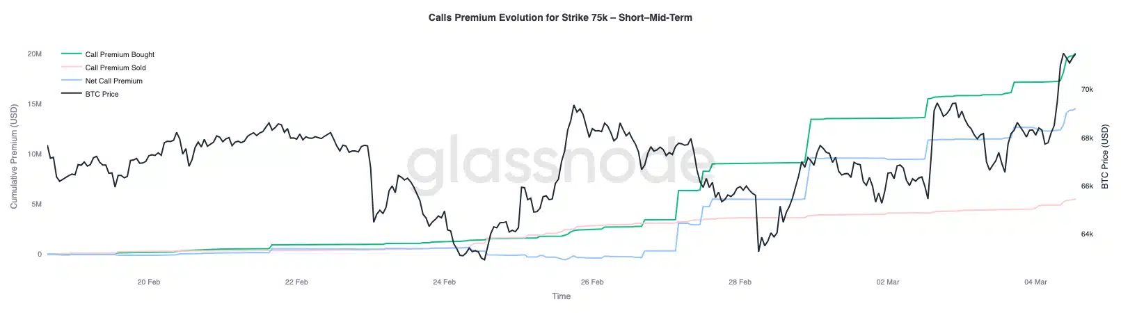 Analizując dynamikę premii dla calli na tym strike’u w kolejnych trzech miesięcznych wygaśnięciach, odnotowano łącznie około 14,5 mln USD netto premii kupionej w porównaniu z premii sprzedanej. Co istotne, niemal dwie trzecie tej wartości zgromadzono w ostatnim tygodniu, napędzając bieżące odbicie ceny.