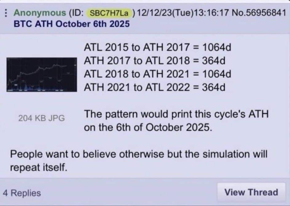 Do tego mamy nieco złowieszczą prognozę. W grudniu 2023 anonimowy użytkownik prognozował, że Bitcoin osiągnie szczyt cyklu 6 października 2025 roku. Bitcoin faktycznie osiągnął maksimum na poziomie 126,2 tys. USD tego samego dnia. Od tego czasu spadł o prawie 20%. Jeżeli trend się utrzyma, Bitcoin powinien wyznaczyć dno bessy za rok … Idealnie wpisując się w czteroletni cykl.