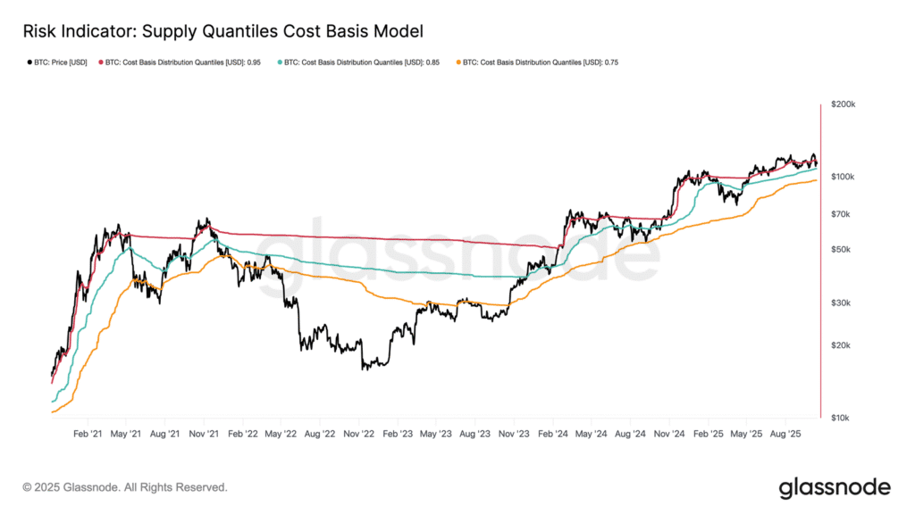 Obecny spadek budzi szczególny niepokój, bo to już trzeci raz od końca sierpnia, gdy cena Bitcoina spada poniżej 0,95-kwantyla modelu cenowego (117,1 tys. USD) — poziomu, na którym ponad 5% podaży, głównie należącej do głównych nabywców, jest stratna. Aktualnie kurs porusza się w zakresie 0,8 kwantyla (107 tys. USD).