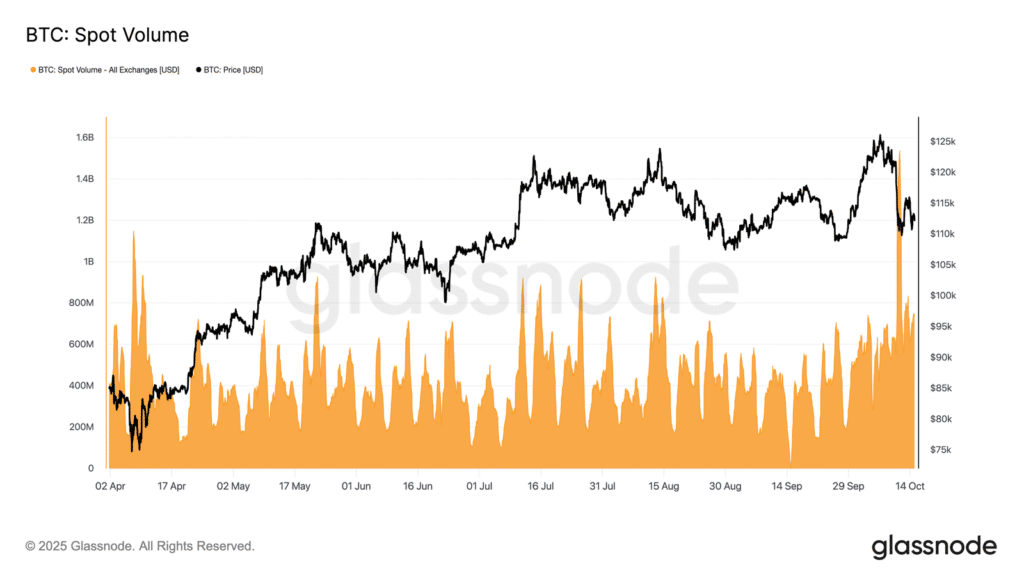 W trakcie niedawnej fali likwidacji wolumeny na rynku spot gwałtownie wzrosły, osiągając jedne z najwyższych poziomów w tym roku. Ten skok odzwierciedla wzmożoną aktywność inwestorów, którzy w obliczu rosnącej zmienności szybko dostosowywali swoje pozycje.