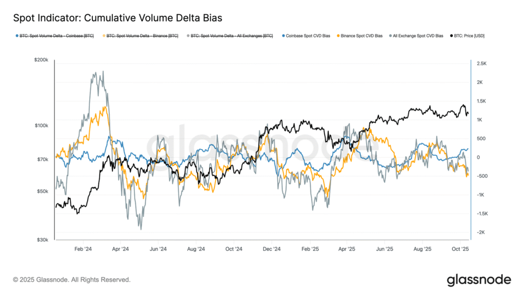 Po zestawieniu wzrostu wolumenu na rynku spot z wskaźnikiem Cumulative Volume Delta Bias (CVDB) — który mierzy odchylenia od 90-dniowej mediany skumulowanego przepływu transakcji — wyraźnie widać rozbieżności między głównymi giełdami. Na Binance dominowała silna presja sprzedaży od takerów, podczas gdy na Coinbase obserwowano netto kupno.