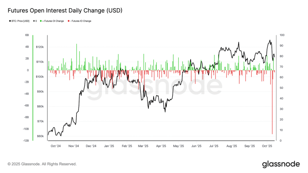 Ostatni spadek otwartych pozycji w kontraktach futures na Bitcoina należy do największych jednodniowych skurczeń w historii, eliminując ponad 10 mld USD pozycji nominalnych. To istotne „przepłukanie” rynku instrumentów pochodnych, porównywalne pod względem skali do likwidacji z maja 2021 r. czy wycofania się FTX w 2022 r.